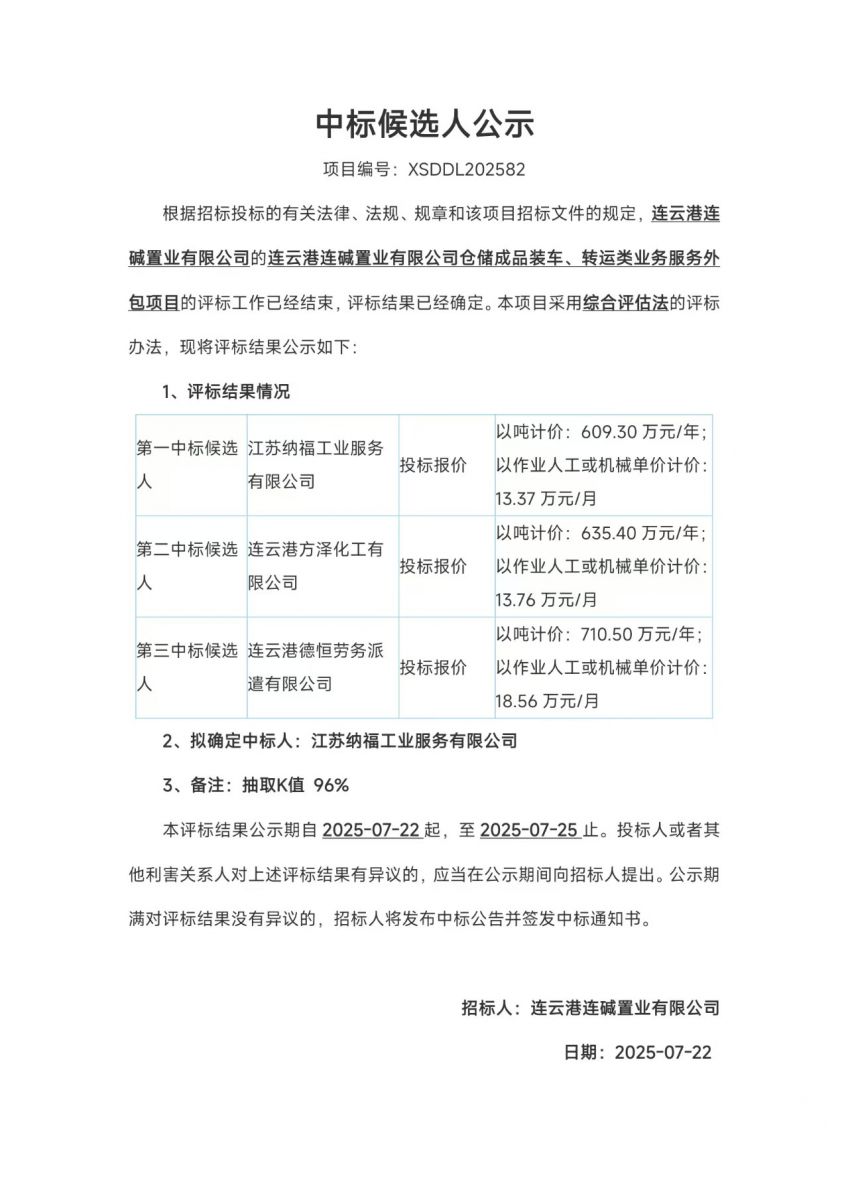 連云港連堿置業(yè)有限公司倉儲成品裝車、轉(zhuǎn)運類業(yè)務(wù)服務(wù)外包項目中標(biāo)候選人公示