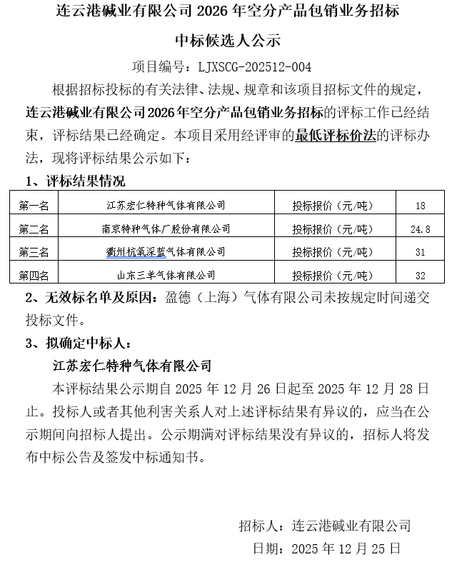 連云港堿業(yè)有限公司2026年空分產(chǎn)品包銷(xiāo)業(yè)務(wù)招標(biāo)中標(biāo)候選人公示