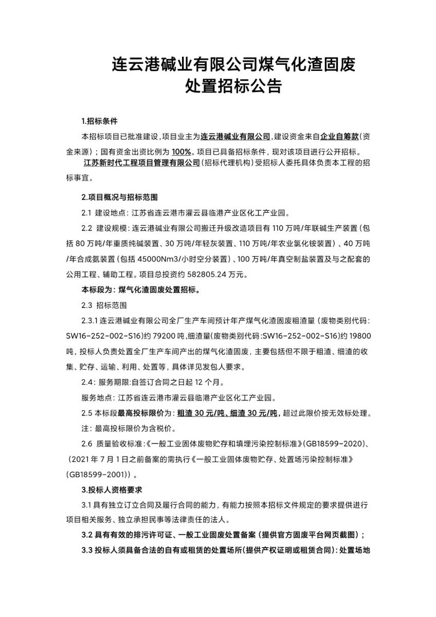 連云港堿業(yè)有限公司煤氣化渣固廢處置招標(biāo)公告