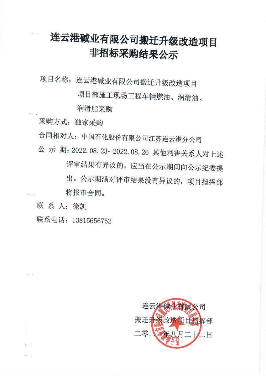 搬遷升級(jí)改造項(xiàng)目施工現(xiàn)場(chǎng)工程車輛燃油、潤(rùn)滑油、潤(rùn)滑脂采購(gòu)結(jié)果公示