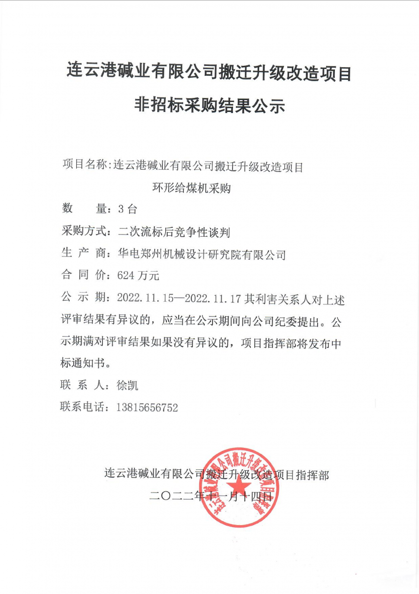 環(huán)形給煤機非招標采購結果公示
