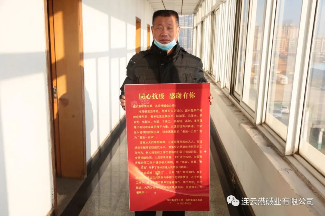 11月份疫情期間,根據(jù)市里統(tǒng)一安排,公司組織抗疫志愿者服務(wù)隊,全身心投入海州區(qū)疫情防控一線。公司職工林慶芝、陳瑞軍、馮茂永、李金龍、張新豐、劉斌、卞保衛(wèi)、張名琦、高健、潘德強(qiáng)等10名職工積極響應(yīng)公司黨委的號召,投入到社區(qū)志愿者服務(wù)行列,沖鋒在抗疫最前沿,為疫情防控作出了突出貢獻(xiàn)。近日,海州街道黨工委、海州街道辦事處送來了感謝信以及錦旗。
