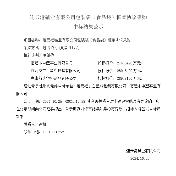 連云港堿業(yè)有限公司包裝袋(食品袋)框架協(xié)議采購中標結(jié)果公示