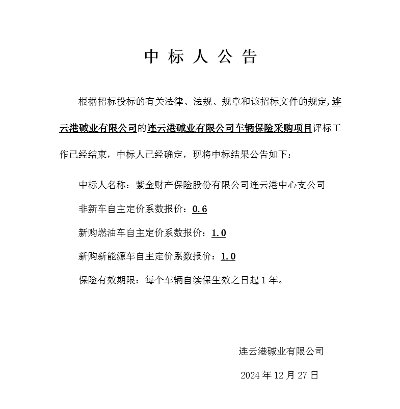 連云港堿業(yè)有限公司車輛保險(xiǎn)采購項(xiàng)目中標(biāo)人公告
