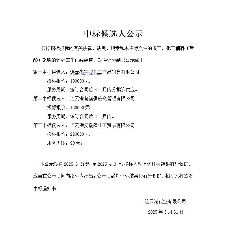 化工輔料鹽酸采購中標(biāo)候選人公示