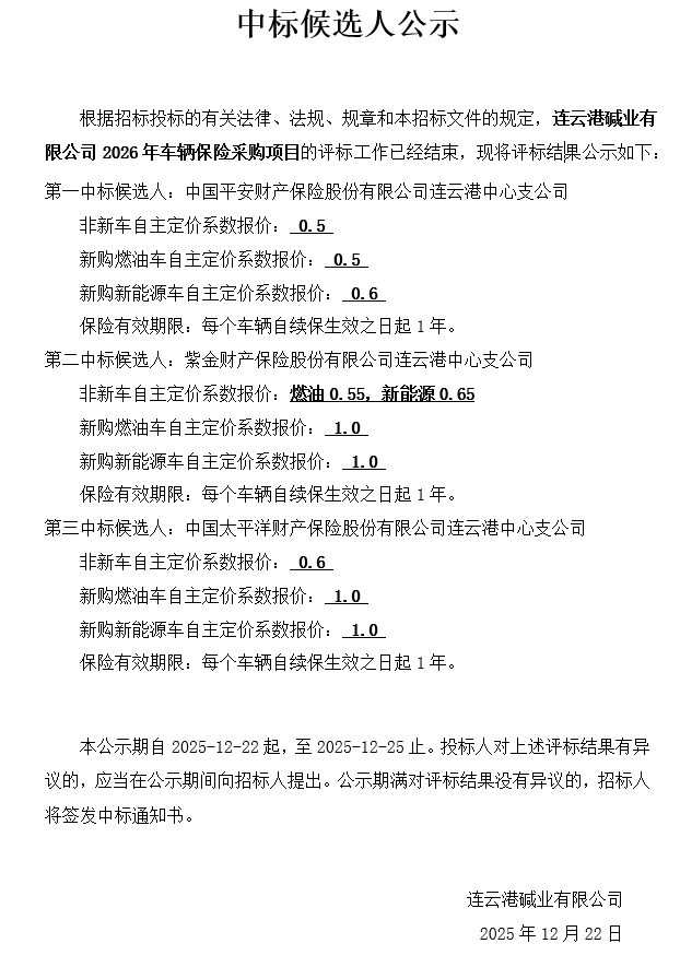 連云港堿業(yè)有限公司2026年車輛保險采購項目中標候選人公示