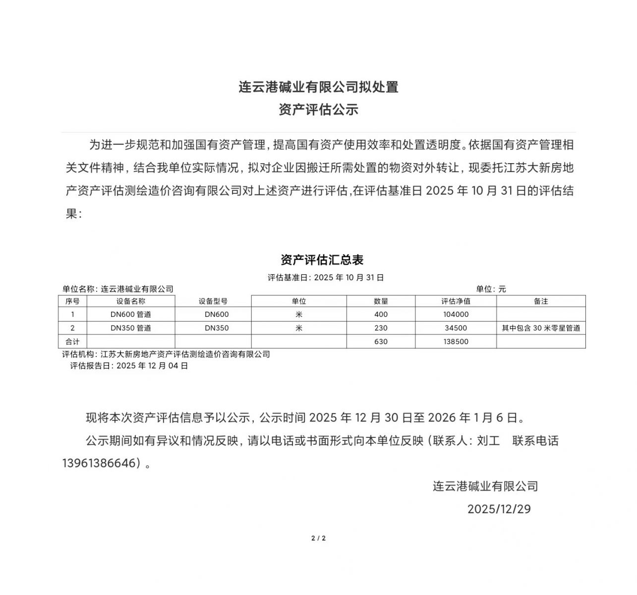 連云港堿業(yè)有限公司老廠區(qū)報(bào)廢管道設(shè)備資產(chǎn)評估公示