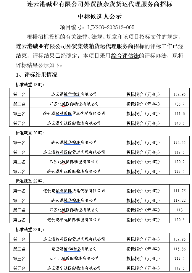 連云港堿業(yè)有限公司外貿(mào)集裝箱貨運代理服務(wù)商招標(biāo)中標(biāo)候選人公示
