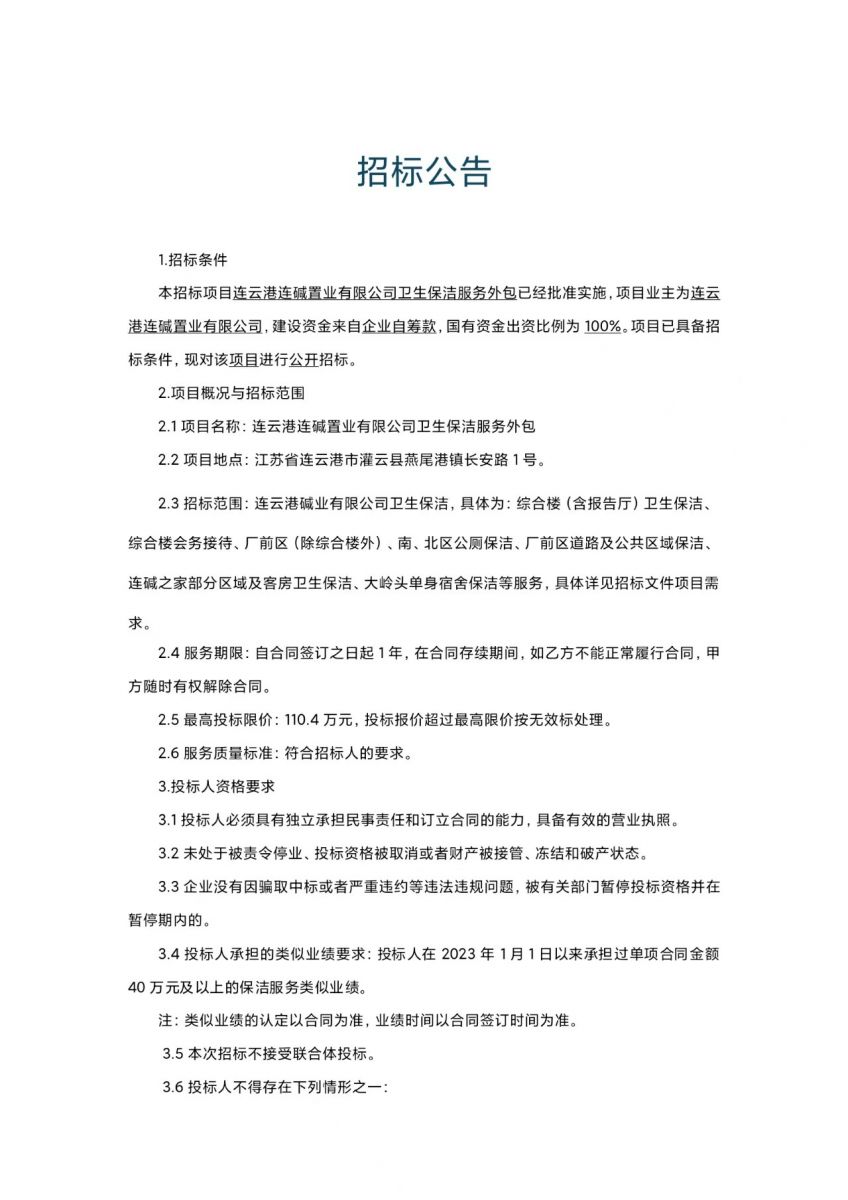 連云港連堿置業(yè)有限公司衛(wèi)生保潔服務(wù)外包招標公告